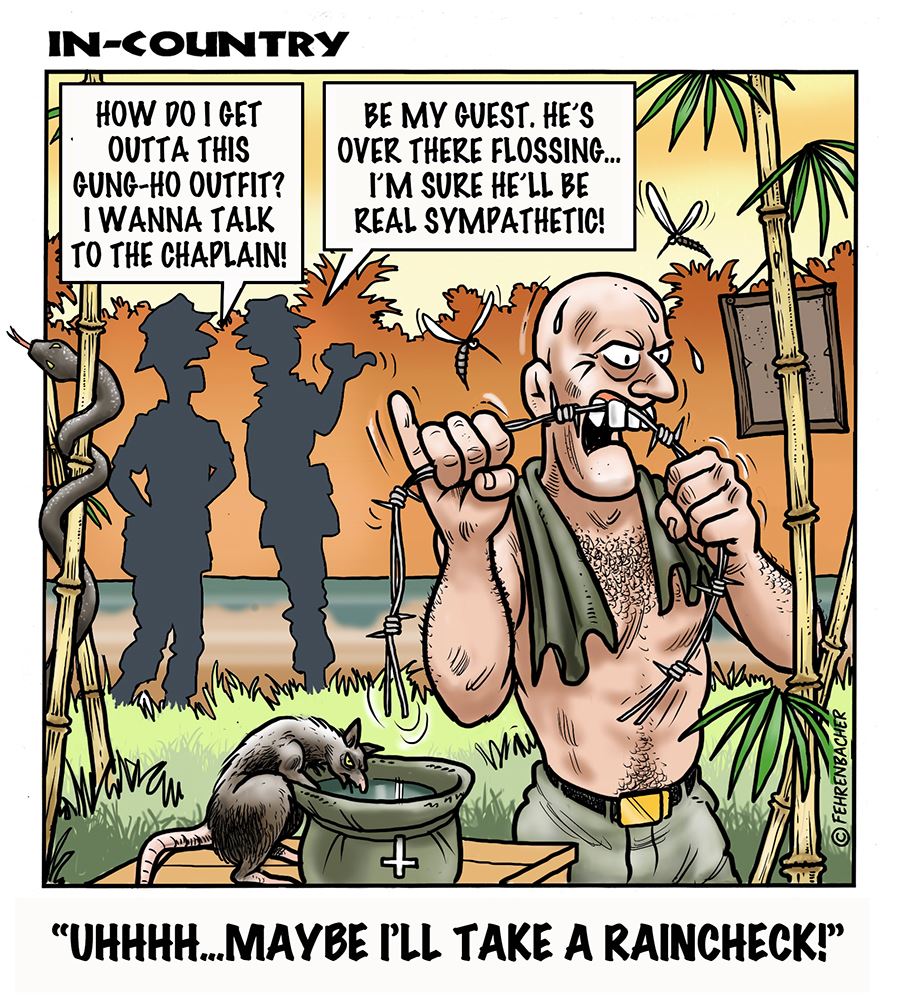 Phil enlisted in the Army in 1965 where you served for years in Vietnam.  He became a graphic designer and has worked for the state of Oregon for 26 years.  He retired in 2003 and started the Cartoon "In-Country".  The cartoons reflect his experiences during his tour of duty in South Vietnam.
