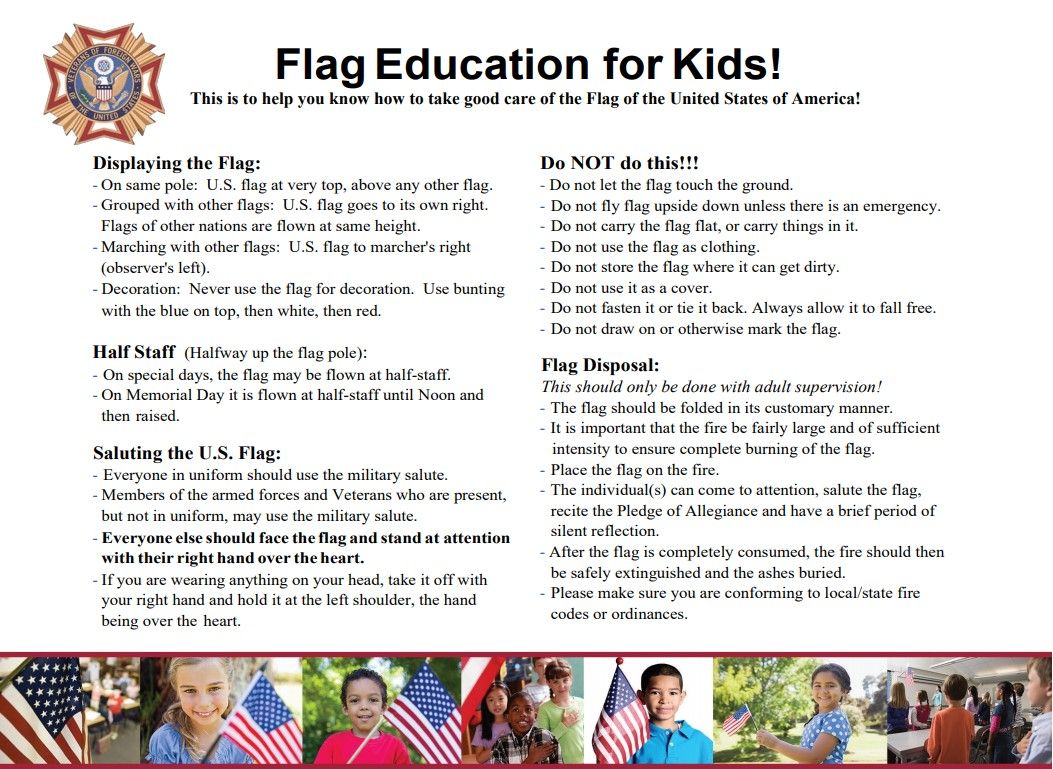 - Distribute U.S. Flags and/or present a certificate of recognition to a local business, private citizen and/or youth group for flying the U.S. Flag. Distribute flags to businesses, community organizations and schools that do not have a flag flying or provide a new flag to those whose flag is tattered. Present a certificate in recognition to those displaying the U.S. Flag or POW/MIA flag. They will be honored to be recognized for their American pride.
